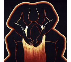 Judy Chicago collaborated with more than 150 needle workers between 1980 and 1985 to create dozens of images combining painting and needlework that celebrate the birth process – from the painful to the mythical.