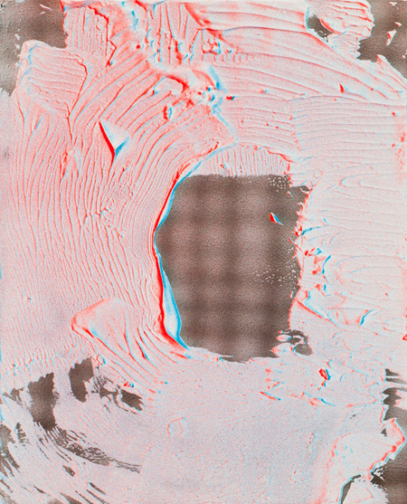 The most effective paintings, such as "Body Double" and "Sleep Deprivation," limit their palettes to black and white backgrounds with hazy red-and-blue fields roughly in the shape of brushstroke silhouettes. The red and blue are viscerally graphic in the mode of an old-school 3D dynamic, creating a look that feels as much like a high-resolution photograph or scan of a painting as an actual material object. The pinks, oranges, and greens employed in other works become a bit more distracting than they need to be, though the odd dichotomy of image and object still persist. To quote the show's release, "how the f- were these made?" I can't put it any better than that.