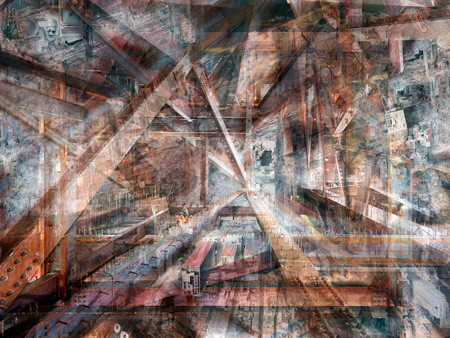 The near abstract images result from layering many images atop one another. The effect is painterly, the surface built up with peaks at and cubistic echoes of what came before, calling to mind Duchamp’s “Nude Descending a Staircase.” A long look begins to reveal various objects and scenes; from chaos emerges clarity as the eye separates the pictures. The contrast to the more straightforward work — cityscapes of New York, taken from afar (the “edges”) — returns us to the more conventional way we experience photos, brings us back to a clear view. Seeing is not always believing, but often it is.