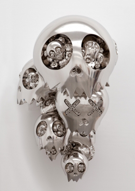 Seen in the context of his classic flower paintings — the latest versions included here are also packed with equally cartoonish skulls — it's difficult to invest oneself in the Death & Rebirth theme that permeates no deeper than surface level, other than to ask oneself with mock-seriousness, "Is nothing sacred??" Meanwhile, the highlights of the show turn out to be Murakami's bling-iest sculptures, which place him more squarely beside Hirst after all. "Flame of Desire" is a 15 ½-foot high totem of undulating flames made of real gold (you can tell from the glow), anchored at its center by a skull sporting numerous smaller skulls in its eyes. "Fate" expands upon the skulls-within skulls formula in a smaller wall-mounted piece that's been coated in platinum leaf. Oddly, through the forthrightness of their over-the-top materialism, these works proclaim their relevance in the challenging format of traditional sculpture, nearly relegating their painting counterpoints to be so much background noise.