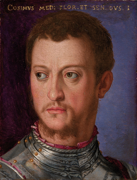 Several of the pieces from antiquity remain intact. These include the sardonic cameos “Icarus and Dedalus, Pasiphae and Artemis” and “Dyonisus on a Chariot Drawn by Psychai.” The latter, originally belonging to Pope Paolo II Barbo, was acquired by Lorenzo. Also on view is the second largest known cameo in the world, “Emperor Sacrificing to Hope” (2nd to 4th century CE) at 14.2 mm in diameter, crafted of rich brown and white onyx with gilded metal. A similar 16th century cameo, crafted with techniques borrowed from ancient times, is “Busts of Cosimo I de’ Medici and Eleonora of Toledo,” of agate and gold. One of the few paintings in this show is “Portrait of Cosimo I,” a life-like oil on tin of the first Grand Duke, painted during his lifetime (1519-1574).
