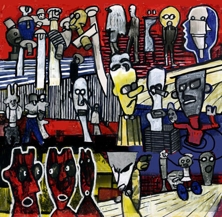 The paint-altered photographs, which range in size from quite small individual pieces to larger ones assembled from up to a dozen abutted photographs, are more whimsical but also owe an obvious debt to the stick figures found in Dubuffet’s copious drawings and paintings. They also share Dubuffet’s palette of de-saturated primaries, browns and greys. In practically all of these, the photographic image functions like the irritating grit around which pearls form. Typically, after O’Connell has finished encrusting the found photographs with his doodles and patterns, only small details of the underlying image remain visible. The simultaneous amplification, isolation, and abstraction of the underlying figures gives strong indication of the source of the mannequin-like figures that crop up — sometimes as a mere constellation of circles — in O’Connell’s abstract paintings.