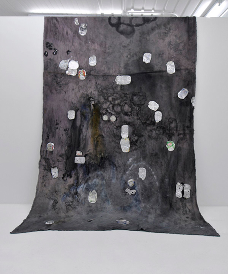 More context about the show: Its centerpiece was a 15’ x 6.5’ bolt of distressed linen, festooned with crushed aluminum cans and chunks of gesso that looked like metastasized wads of chewing gum. It was unceremoniously draped (“draped” is too lyrical a verb; “schlepped” better captures the spirit) over a partition in the gallery’s center, as if to simultaneously reference and desecrate the tradition of the Renaissance tapestry. On the walls hung two photographs taken inside a derelict building whose tiles had crumbled away, exposing the trowel-and-mortar work underneath. On first glance from middle distance, viewers might assume the photographs were paintings and mistaken the masonry’s sumptuous impasto for Kennedy’s own brushstrokes. Closer inspection reveals that they are actually an “F.U.” to the notion of the artist’s hand itself. Without exception, the works’ titles were inscrutable acronyms. One was called T.H.Y.I.T.F., another P.T.B.A.T.P. The title of the draped linen piece consisted of no less than 28 letters all lined up, full of sound and fury, signifying — what, exactly?
