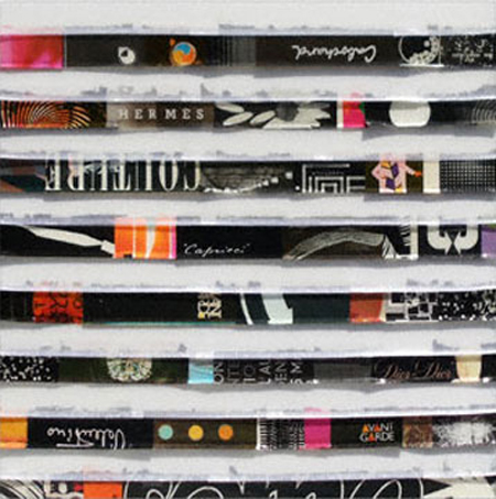In part that’s because the fragmented texts Verbicky throws at us are not just empty words. They are the trademarks, name brands and logos of pricy, upscale consumer goods. There is something powerfully disconcerting in the way the assorted Gucci, Chanel, Vogue, Cinzano and other logos zing out from each painting to grab our attention. No matter that the artist will often invert the names, turn them sideways, or slice off a portion, they still remain identifiable. Indeed, so arresting are these commercial icons seeded amid the other bits of appropriated pattern and trendy color that we begin to seek them out. Hunting for other upscale logos we quickly become like those shoppers who look only for the names of famous designers or brands. That’s an interesting and uncomfortable position to have art put you into. One that subtly suggests that we consider not only the way the barrage of advertising’s media culture directs our consumer taste and choices, but can even call into question our fascination with the very art we are looking at.
