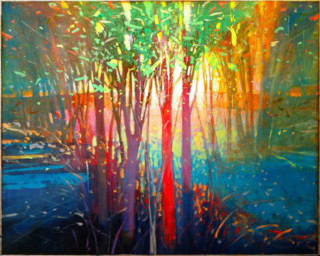A quick glance at Mark Gould’s effervescent, many-hued paintings contain a radiance which perhaps can best be attributed to a spontaneous, dynamic approach to art-making. Gould lives in Taos, that high desert artist enclave; it’s intriguing, then, that "Arcadian Calm" is so full of radiant forest scenes in dazzling oranges and juicy blues. "Quick Light; Arcadian #941" is drenched in this brilliant color. The composition is dominated centrally by a small grove of willowy trees, topped with fluttering green and golden leaves. This diminutive forest is bordered on either side by sparkling blue earth or water, making the painting feel not only enchanting but also deliberately, harmoniously arranged.