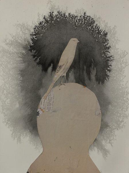 Stas Orlovski, ''Head with Bird,'' 2013, ink and collage on paper, 15 x 11''.