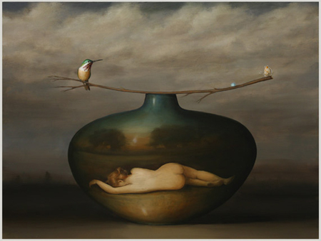 A graduate of the Art Institute of Chicago and San Francisco Art Institute, Kroll’s technical skills are impeccable. Except for the fish out of water, he can make us believe that anything he paints is real. Over and over, birds are linked to priceless porcelains, or Japanese imari ware in the case of “Egret and Bowl.” In “Crow,” the bird perches near a Rookwood scenic vase, creating a landscape within a landscape. In “Hummingbird and Butterfly,” among the more complicated compositions, a nude reclines on the side of another, fatter pot. The cloudy sky may foretell the demise or endangerment of both creatures. Until then, each vignette captures a moment of natural grace, only mitigated by the manmade presence of the objets d’art.