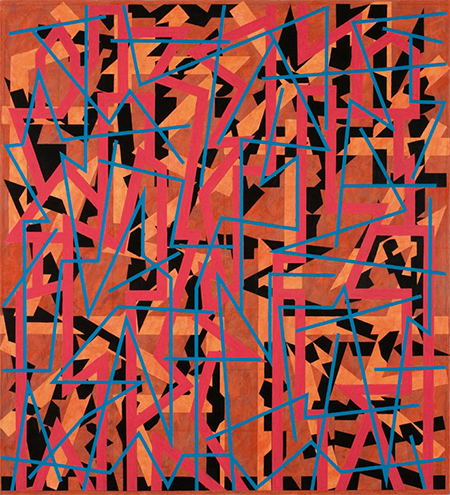 Three angular sculptures made from wood and aluminum, created in the 1980s, add to the mix, while “Red Crane” (1982) sets the tone for Mieczkowski’s more current work. This 6-foot-high canvas draws the viewer into a zigzag tangle of overlapping colored lines, with interruptions of black to add depth and challenge the eye. Additionally, in two complementary canvases, “Op 4 (Red)” and “Op Cross Blue,” (both 2006), the artist’s mathematical precision turns an array of Pac Man-like dots into eye-popping neon crosses.