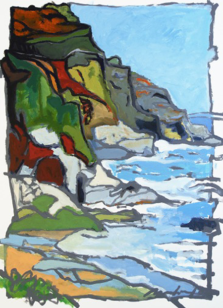 Given such extremely traditional and conservative subjects — still life, seascape, architecture — there is plenty of variety, albeit predictable and unsurprising. The smaller works are the sketchiest, i.e., closest to drawings, yet “Apostles” and “Nosh,” an ocean scene and a table top of food, averaging seven by ten inches, strive to be paintings amid the overkill of outlines. A few welcome jabs of white paint in the coastal view liberate its stolid sinking of half-submerged rocks and boulders. “Lush,” “Geometry,” “Back Road,” and “Late Night Mambo” are like the old Morhous: echoes or yearnings of 1930s French painting á la Vlaminck or Derain. Linear clots of black hem in bright primary colors, but do not permit clear optical access into the painting.