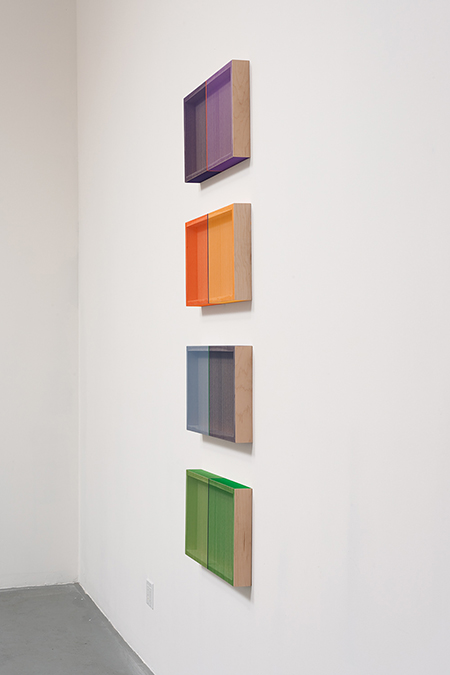 Brian Wills' formalist abstractions have distinguished themselves by merging over into sculpture, but more particularly by his use of rayon thread, which makes for a particular quality of stripe. His investigation of the rayon thread’s potential in various implementations – traditional vertical stripes; crossing vertical-horizontal square mandala patterns; strung across hollowed out sections of subtly painted or stained wood panels – has here led to its most visually dazzling iteration: two-sided wall works that jut out towards the viewer like the corner of a cube or column. Each side presents patterns that liquidly shift and modulate as you move across them.