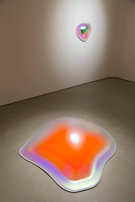 Walking into the gallery space we are immediately mesmerized by the luminous, organically shaped jewel-colored sculptural forms hanging from the walls. There is a sci-fi element: these forms feel ‘alive’ and it is only natural to wonder what may be germinating inside them. There is an iridescence to these smooth-surfaced, shiny shapes where light is emanating from within rather than from external lights interacting with the works. This illusionistic sense of inner glow comes from the proprietary fabrication process of these blow-molded acrylic works.
