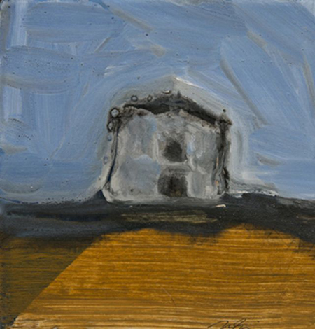 Cochran also works on wood, metal, and tile. "Gold Hen" is painted on a modest square of ceramic tile, whose covering of bubbly glaze implies a snow-flecked surface. The titular hen is rendered in jaunty strokes of uniform brown, with barely discernable black eyes. Hasty gray smears form a smudgy halo around the artist’s "White Church in New Mexico," which is foregrounded by a black chicken and a cartoonish green bush. This is modest work that is both pretty and pleasing.