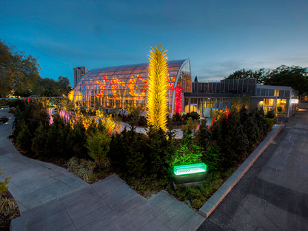 The repurposed building next to the Space Needle (which helped fund the undertaking) is surrounded by two acres of landscaping by Richard Hartlage Land Morphology that echo prior Chihuly garden installations, the first of which was at the Garfield Park Conservatory in Chicago in 2001. Last year at CGG, over 26,000 bulbs were planted to accompany the outdoor displays of glass, all centered with a large glass “conservatory” used for private parties and charity fundraisers. This, too, recalls a previous body of work, the “Garden Cycle,” the most important of which was at the Royal Botanic Gardens in Kew, England in 2005.