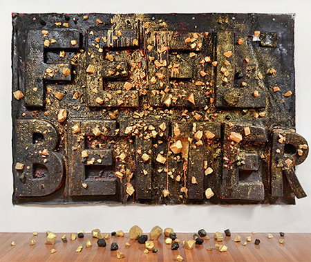 Google “feel better” and 130,000,000 suggestions for attaining happiness pop up in 0.24 seconds. If the American Dream is working, why are so many of us overdosing on sugar laden treats or seeking joy in the endless line-up of adorable pets that populate You Tube? Miyoshi Barosh opens her examination of this conundrum by confronting us with “Feel Better,” a mattress-sized wall sculpture of a chocolate bar flecked with gold, imprinted with its title, commanding us to improve our emotional state. This humungous symbol addressing the pitfalls of destructive consumption is in a face-off with four digital prints of adorable kitties across the room. A scattering of burns revealing underlying collages of colorful printed fabrics mars the kittens’ irresistible faces. In an adjoining room, Barosh’s “Arcadia” is a standout adaptation of crazy quilt fabrics into a folksy 3-dimensional suggestion of computer gaming landscapes. Re-interpretations of vintage post cards of scenic America with titles such as “Monument to Manipulated State of Well Being” reinforce sculptures including “Monument to the Triumph of the Therapeutic,” emboldening Barosh’s captivating examination of a variety of ways in which cultural failure has become internalized.