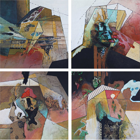 Delair Shaker calls the mixed-media abstract pieces in his small solo show “Desert Structures,” as opposed to the crumbling structures he left behind in his native Iraq more than 20 years ago. The pieces — evoking jagged desert landscapes, Native American design and earthy colors — signal the resurgence of his life and art in Phoenix, where he has lived since 2005. Yet, visible in the works are torn pieces of fabric, bits of glass, burnt paper and broken lines — possible reminders of Iraq’s instability.