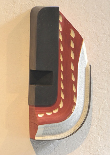 Hayes’ current exhibition, titled "Volumes," comprises seventeen works, predominantly wall-mounted, with some pedestal-mounted. Each piece cradles an excerpt of printed text cut from mass-market novels, luxury-edition classics (with that telltale signifier of gold edging on the pages), dictionaries (replete with teardrop-like finger tabs), and even, if I guess correctly, some computer printouts (minus the sprocket perforations). These sheaves of paper are curled and folded into simple forms — no gee-whiz origami here — that are gently held in place by armatures of steel and brass that complement the page waveforms — and suggest by their color and patina the leather and vellum of old editions or dark mahogany bookshelves. (One piece even has medieval-style metal hinges.) Some of the pages have been guillotined so that the text is visible (illegibly) on the page edges, creating a new kind of coded writing to be read perpendicular to the printed surface, like paper rolls from, say, seismographs. Others call to mind nineteenth-century instruments like wall clocks. Two of the works fold the pages around handle forms, so that we see them as cleavers or axes — perhaps, per Kafka, for breaking the frozen seas inside us; or, per Brecht, for hammering into shape a new reality. In addition, the pages are not glued, so that a careful bibliophile could hypothetically leaf through them. While the sculptures’ shapes derive from minimalism, and could be easily enlarged to monumental scale (assuming that Hayes replaced the pages with, say, laminated wood or layers of felt), the effect of these bookshelf/tabletop sculptures is intimate and even elegiac (at least for those of us who love books as objects, not just aggregations of free-floating text). This is an impressive Bay Area debut for a young artist who is already receiving serious attention.