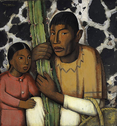 This is the first major exhibition of Alfredo Ramos Martínez' work made while living in California between 1929 and 1946, and it's simply a dazzling display of artistic virtuosity. Born in Mexico in 1871, Martinez is considered by some to be the “Father of Mexican Modernism.” As a boy he was recognized for his artistic talents, and won a scholarship to the Academy of Fine Arts in Mexico City. Later, during a decade in Europe, he learned European academic tradition as well as the art of post-Impressionism. Back in Mexico, he helped found and direct the Open Air Schools of Painting. In 1929 he moved to Los Angeles, partly due to the need for milder climate for his sickly young daughter. Here he produced the remarkable body of work that is represented in this show, under the theme of looking back to the peasants of his native land. His drawings, paintings, and murals depict Mexican women and men with a somber dignity, sometimes even serenity. There’s a monumental quality in their grave countenance and in the stolid mass of their torso.
