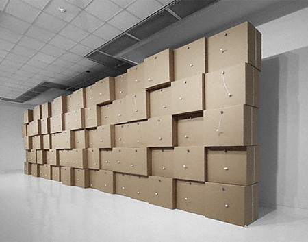 An earlier work such as "25 woodworms, wood microphone, sound system" (2009) is the flat-out amplified noise of live woodworms chewing a hunk of rotting wood, the sound not of technology but of nature. Recent work continues to make extensive use of cardboard and other basic industrial materials and massive repetition, but explores even more deeply aleatoric, or chance-controlled sound. The level of deliberate control and rigor is counter-balanced by the inevitable (de)generation of the overall sound, although Zimoun is clear that he is “not using chance to discover unexpected results, but to elevate the works to a higher level of vitality.” “Wall of Sound” appears to be less structured than past works, as there is no room or substantive wall constructed; instead, uneven stacks of percussive boxes sprawl apparently haphazardly throughout the gallery space like a maze with no perceptible grid. Indeed, the reference to a “wall of sound” is pointedly directed at Phil Spector's famous early 60’s pop song production technique of layering multiple guitarists playing the same parts to create a density in the background music. Here, the gallery space itself becomes the instrument, and as the viewer moves through the space, “the wall” of sound will change and shift. As John Cage famously said, “music ... is not an attempt to bring order out of chaos ... but simply a way of waking up to the very life we’re living.”