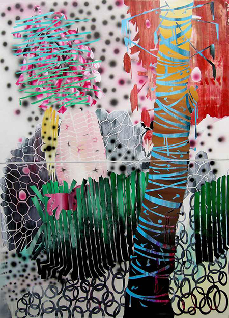 The artist executes his pieces, in part, by masking off spaces and sections of surfaces before brushing, spray-painting, and/or drawing in and around them. This allows Hatton to blend architectural muscle with Haiku tenderness. Pieces present multiple sections overlapping with layers of dots, stripes, cylinders and cell-like fractal patterns separated by softened hard-edged borders produced by the initial taping preparation.