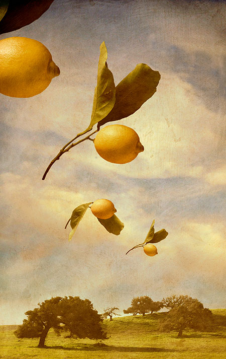 Ingraham’s primary medium is the black-and-white or sepia-toned photograph, which she further explores by boxing the photos or applying them to a heavy panel with resin. Often the main subject is positioned onto a neutral background in a photographic construction. In fact, unusual juxtapositions of objects through image manipulation is one of Ingraham’s trademarks, which she elevates to surrealism in a work such as “Flock of Lemons,” depicting four idealized lemons with leaves as wings, all of them “flying” in formation over rolling green hills. Similarly, “Limoncello Triptych” features a lemon on a string making its way over a romanticized countryside. Bird imagery is commonplace, often to suggest reverence for the natural world or freedom, as in “Yearning,” a dark, house-shaped hanging box in which the bottom image is outstretched hands and the top image is a bird in flight.