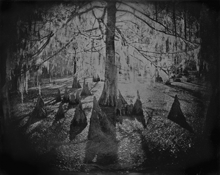 Keith Carter’s new photographs from the series “Ghostland” are moody, mysterious and often as murky as the East Texas swamps where he grew up near the Louisiana border. A mix of landscapes, still lifes, portraits and moon studies, as well as a few ethereal double exposures, comprise this show of 30 small black-and-white collodian tintypes (and one archival pigment print), all presented in black vintage frames. The collodian process, which was invented by Frederick Scott Archer in 1850 and quickly replaced the daguerreotype, was popular for several decades before being replaced by a dry gelatin technique. The challenging collodian process requires that a glass plate be treated and exposed in the camera wet before being developed within a few minutes under a red light. Photographers like it because the shots can be instantly adjusted for lighting and composition. The historic process requires ingenuity and problem-solving, however, and if the photographer shoots outside, he or she needs a portable darkroom.