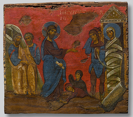 With the growing number of churches, monasteries, and other religious spaces as Christianity took hold, wall frescos became popular. It’s impressive how fragments have been removed and preserved for display. One from Thassaloniki dated 1360-80 shows seven of the Apostles seated on a semicircular bench, about to have their feet washed — a ceremony reflecting the humility of the foot-washer, who is not shown. The exhibition features quite a few icons — portable paintings done on wooden panels, generally using egg tempera — but don’t be disappointed that a number are in poor condition, with battered edges and cracked and flaked-off paint. After all, they’re over 600 years old.