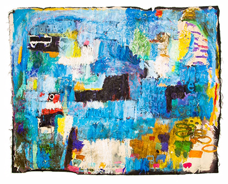 Among the pots of gold for me at Leary are Carole d’Inverno’s new pale, colored-pencil drawings of architectural and landscape plans (her best work yet); Tony Horn’s “Nine Views of Abe Lincoln” (his first show in 25 years); and best of all, “Highway” and “Blue is the New Black,” two raucous gestural oils that echo an abstract expressionism rescued from the train wreck of postmodernism. With torn, vigorous surfaces bordering on the topographic, sublime flatness is sacrificed to a bustling dynamic of shapes, images and word fragments. Patrice Tullai, the artist, lives alone in a cabin near a flowing river, where she also painted “The Sky is Falling.” Finding her work at Leary, the season of the double rainbows has not let me down. With such visual riches in the spring salons, the rainy season can now resume.