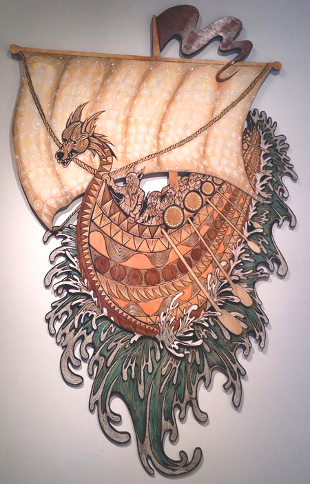 The wolfbat is only one of many creatures in McNett’s oeuvre. A moth with outstretched, intricately patterned wings is named the “Black Witch Moth.” A ram with large curving horns and a snake growing out of its forehead is named “Old Winter Deity.” And a caterpillar-like creature with a single large eye on its forehead is “Yellow World Deity.” McNett carved and painted these pieces from wood, adding elaborate designs. Four tribal masks were created from etched leather and wood surfaces that had been shaped using epoxy. As a prolific printmaker, McNett often collages his prints onto various surfaces, including wood that has been shaped into the hull of a ship. He has created several of these Viking ships, using two of them in a non-permitted parade through the streets of lower Manhattan. All are included in this installation. McNett’s designs have been used to decorate everything from skateboards to snowboards to shoes. He was invited to design a Barney’s window display in 2010, and his work was included in a survey of graffiti, street, and urban art in 2009. The current exhibition is both contemporary and ancient, putting viewers in touch with their inner wolfbat.