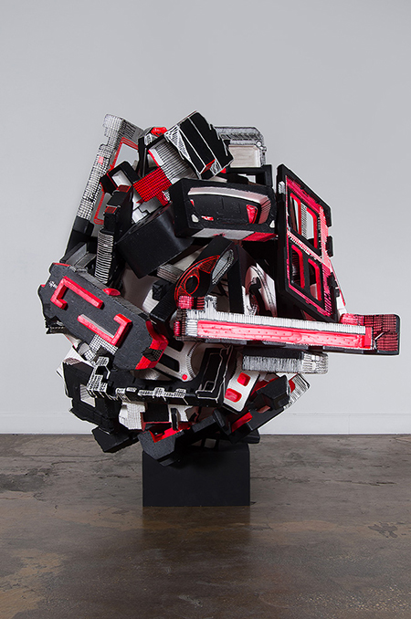 In "Redesigned, Repurposed, Re-everything" Jaime Scholnick presents a medley of works on paper and sculptures. The sculptures are made from polystyrene packaging saved by friends and family and collected for use in her artworks. The disparate packaging is sometimes left white other times covered it with lines, blackened or painted in bright colors. Scholnick molds these awkward building blocks into large sculptures that cascade off the wall, as in “Swoosh!” They sometimes evoke architectural monuments, as in "Lipstick Tower" and "Aaron's Dream." Scholnick's installation juxtaposes her sculptures with collages that are made by covering magazine pages with gridded lines obliterating the images while leaving enough of the original to retain a suggestion of their shape. Scholnick has an assemblagist's knack for turning what is discarded into beautiful and compelling artworks. The works on view in the West Gallery introduces three artists — Anna Breininger, Erica Mahinay and Lauren Satlowski — who recently moved to LA after receiving MFAs from Cranbrook Academy in 2013.