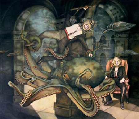In “Submerged" Chaix mixes those ecological alerts with the fantastic, taking us on a dreamlike journey into watery depths where man and beast comingle in unexpected ways. The most dramatic creations are those featuring businessmen in suits wearing antique diver helmets in submerged cities. One sits in lounge chair on a water-filled subway car among sharks, caressing an eel; others bide their time with slippery creatures in living rooms. One Wall Street type attempts to puppeteer an unruly octopus in a clear nod to man’s egoistic will to control nature. This stark and unusual imagery compels us to ask if we are viewing a future Atlantis or the next Water World, and whatever the opinion, the answer is clear: the oceans, from which all life sprang, will soon reclaim us.