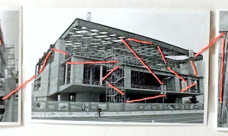 Performance-based works rely on photographic and video documentation because that is usually all that remains. Popp understands the difficulties of bringing durational work into a gallery setting and thus makes a point of transporting what occurs on site into the gallery. Here she constructs a temporary wall that bisects the gallery entrance. From the back the wall is clearly unfinished, referencing a building under construction. The verso contains a mural of one of the construction sites where Popp has performed. This mural, as well as two others are mounted in the space, perforated and then stitched together using the Mason Lines which become an installation of crisscrossing orange pathways. Two performances coincide with the exhibition: one during the opening, where Popp perforates the entry wall and threads it with Mason Line. At the closing of the exhibition she dismantles that same wall. Smaller photographic images of construction sites also perforated and stitched together with Mason Lines dot the gallery walls.