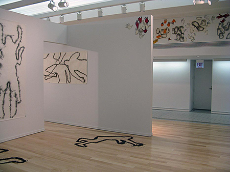 The walls and floors of the space display a series of works in which the artists have employed their own bodies, tracing the outlines of their figures with trails of loose black oil sunflower seeds on the wood flooring, and gunpowder that has been applied to paper and then ignited. Of the figures depicted, a few are neutrally posed, though most feature outstretched arms, legs frozen in action, as if the bodies were halted as they tumbled or fled. Aesthetically, the works immediately recall two differing references: that of ancient cave drawings, and more poignantly, the kinds of chalk outlines we associate with the scene of a homicide. On display through the warm summer months when Chicago’s gun violence skyrockets, “AGAIN GONE” is in that context suggestive of the city's most serious issue. Eschewing shock and didacticism, the works acknowledge the fragility and ephemeral nature of life with both urgency and empathy.