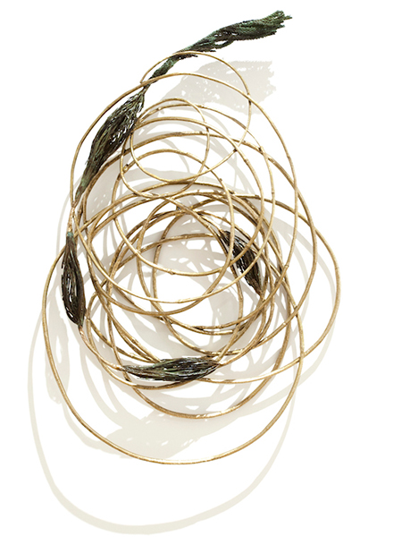 Saito’s floor-standing series, "Gymnopédies: Bamboo Gymnast," derive their titles from Satie again, whose wry, lyrical piano pieces refer obliquely and ironically to the naked athletic performances of the ancient Greeks. Twelve small starlike pieces of similarly intersecting branches, hung informally on the wall, contain metallized botanical samples, e.g., seed pods and bits of bark, cactus, Christmas tree — even a pineapple slice. These “Golden Stitch” works are curiously suggestive, for all their indisputable decorative charm, of Kafka’s cheerfully makeshift creature, the Odradek, or, to escape the cultural realm, aerophytes, small plants that live, rootless, on airborne nutrients, symbolized here by the intersecting branches, botanical versions of Cubist planes and Futurist lines of force.