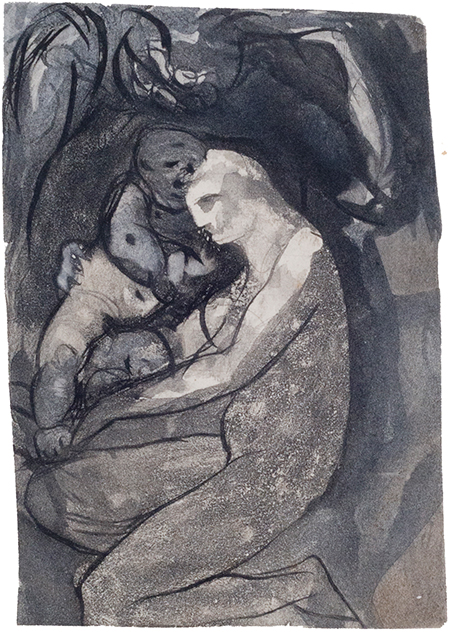 The human form occupies much of each drawing. Put into a tight space, almost reaching the paper’s edge, figures seem to exert all their strength attempting to release themselves from an imposed bondage. Capturing the fluidity of the human body, first in clay or stone, to become bronze, shadows are inevitable as changing light bounces off solid mass. Rodin masterfully transfers sculptural elements to the graphic — solid heft in three-dimensions became a two-dimensional drawing of line and shape. The sculptor had an uncanny ability to also work with the nature of non-dimensionality, to take what can be touched to convey the ephemeral, namely light and atmosphere. Beyond subtlety of effect, this element adds hidden qualities of the human soul.