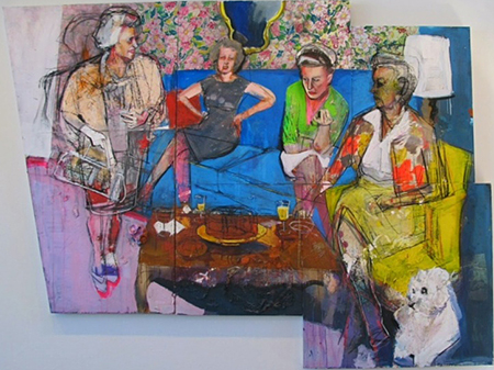 Abigail McLaurin is a figurative artist with an expressionistic approach to painting and an interest in families from the baby-boom era. She likes to work from period photographs that are either emotionally charged or emotionally flat. A background in stage design may explain why many of her paintings are so large that they seem to envelope the viewer, as in “Dead End,” a multi-panel work mounted in a corner that measures seven feet tall by nearly ten feet wide. The speed with which stage sets are usually painted may also have influenced McLaurin’s brushwork, which is muscular — she applies the paint with abandon in some areas, resulting in energizing drips and splashes, as well as wide, visible brushstrokes. Some of her figures’ faces, however, are penetrating portraits executed with great attention to detail.