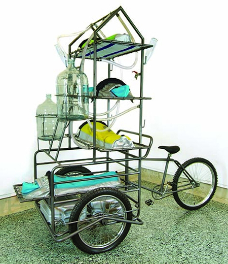 While Tiravanija's work has translated from stage to gallery thanks to an oeuvre made up of different styles of work, with Studio Orta that translation is less fluid, as the aforementioned design = pedagogy challenge is inevitable. There are of course exceptions, most notably "OrtaWater — Bottle Rack," a large Duchamp-style bottle rack filled to maximum capacity with clear drinking bottles and crowned at the summit by a Sparkletts-sized glass water jug. The "OrtaWater — Mobile Intervention Unit" is another strong piece — a bike refabbed with simple metal shelves and interconnected tubing designed for maximum rehydration delivery — that lends an appropriate air of urgency. Otherwise, the works in this gallery may very well raise more questions around preaching-to-the-converted and art vs. design vs. engineering, than it will incubate production-based think tanks for addressing the challenge of rapidly receding planetary resources.