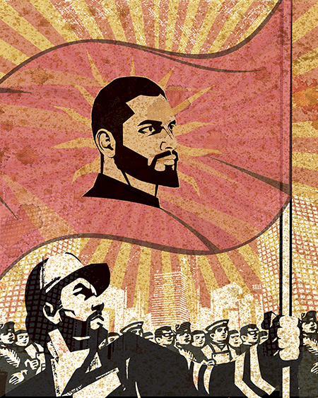 Obaidi was born in in Baghdad, Iraq but studied film and new media in Canada and Los Angeles. He explores the visual construction of authoritarian power, creating an imaginary ruler and his political campaign using powerful graphics and propagandist methods employed by such dictators as Stalin, Mussolini and Hitler. The leader appears on flags and postage stamps or standing behind fierce, machine-gun toting men, reminding us how power, propaganda and art are intertwined.