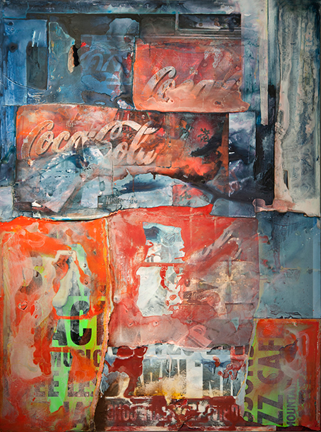 "Bangkok Chinatown," another mixed media painting, is layered even more severely. A cacophony of variously sized posters and photographs each compete for space on the wood panel. Advertisements for Coca Cola, one of the few familiar symbols adorn the top half while the red, white, and blue color scheme continues throughout. Rather than feature the products, these advertisements serve more as relics. They are about to be lost to the rough streets and shout for a continued purpose.