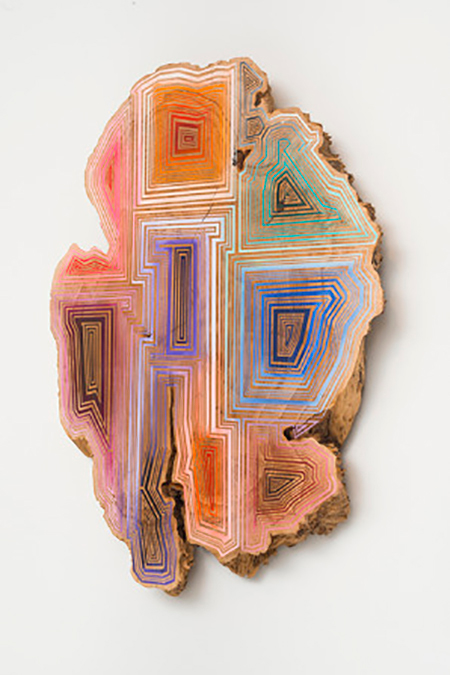 Jason Middlebrook has quite a varied overall practice, addressing the intersection of the natural world and the man-made one with objects, paintings and site-specific installations created from concrete, mosaics, found items and live plants amongst a myriad of other materials. However, the signature examples of his oeuvre (and perhaps the most saleable) are his plank paintings, which comprise his current exhibition, “There is a map in every tree.” Featuring intricate line work of acrylic and spray paint inspired by the grain of the natural wood planks to which the paint is applied, these works not only embody a respect for the organic material, they also engage the history of painting with their frontal orientation and geometric compositions.