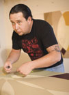 A native of the Claremont area, Couwenberg got his BFA from Art Center in 1995 and his MFA from Claremont. “About half way through I realized that I really liked to apply paint to a surface,” he recalls. “I wanted to find a middle ground between expressionism and hard-edge abstraction. I was really into laying down grounds of paint, leaving the hard raw edges but exposing the underpainting, revealing the history of the painting.” While at school, Couwenberg took a class with painter Karl Benjamin, known for his jazzy optical geometries, and Benjamin became his mentor. Yet beyond their superficial homage to the modernist tropes of half a century ago, Couwenberg’s work culls from a wide variety of sources rooted in colloquial design and SoCal popular culture. “I’m a product of Southern California,” he states. “I grew up skateboarding, surfing, around a car culture, I grew up in the 60s with that Southern California design aesthetic... At a certain point, it all clicked.” The influence extends beyond his formal vocabulary; his lacquer finishes often recall car finishes or the varnish finishes seen on surf-or-skateboards. Couwenberg’s surfaces vary dramatically, from loose painterly sweeps to flat matte color fields to elements that seem glossily translucent. All of these, impressively, are devised from acrylic paint, which he mixes in different ratios to attain different effects. His process is complex and non-linear: sanding back into a surface, masking it, adding flat sections with a sponge roller, then often remasking and revarnishing.