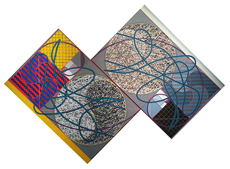 The artist’s own theoretical concepts, which he refers to as the “Phenomenon-of-the-LINE” and the “Displacement of Volume System” come into play as well. Bott has long utilized a system of symbols, patterns and modular components in his paintings and sculptures. Two shapes have been the foundation of his work for more than 40 years. One looks like a stylized Egyptian mummy, while the other resembles a quotation mark. This show is no exception, with one major addition. The paintings are overlaid with highly stylized renderings of the aforementioned “scribbles,” including the zigzag line, multiple loop line, roving open line, etc. These reference the rhythmic, repetitive, scrubbing motion common among two-year-olds given markers and paper. Using layers of glazed acrylics, Bott effectively combines the scribbles with his own beautifully articulated forms and patterns. His selection and juxtaposition of color, as well as his meticulous execution, add up to a body of thought-provoking paintings.