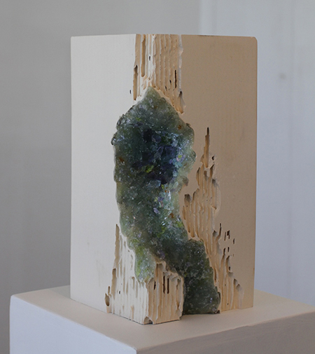 "Rise and Fall," the largest piece at five feet tall, is human-scaled and anthropomorphic (as well as anthropogenic). Its rough-hewn or eroded carved-out areas, exposing corrugated chambers within, suggest bombed out buildings and rotting wood, as well as Expressionist/Surrealist sculptural figures. Three single-brick sculptures, "Red Vug,” "Blue Vug" and "Green Vug," feature cavities decked with colored lead crystal suggestive of geometric geodes. (A vug is a geological fissure with crystallized mineral deposits.) Three stele-like slab pieces, rectangular sheets aligned vertically, look back to the wax pieces Colosky showed several years ago, striated and deformed, like crumpled sheets of paper (or maps), straightened out imperfectly; they might represent the grid of culture, riven by natural stresses and dislocations, if I may remind those not aware of it about the Bay Area's seismic history.