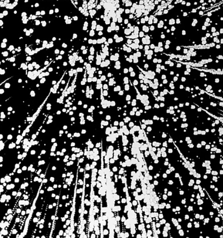 Reflections on Walter Benjamin's seminal essay "The Work of Art in the Age of Mechanical Reproduction" often crop up around Short's work. The paintings, which, among other things, are simultaneously representations and abstractions, offer a sly rejoinder to at least one angle of Benjamin's thesis — no matter how many degrees of separation an image departs from its original source, that final image stubbornly becomes an original itself. On a more pedestrian level of inquiry, new (but old) questions arise: what should one make of the recurring stylistic patterns? The visual iconography seen in "Untitled (green)," in particular, which can be described as a cross between a vague starburst pattern and light leaking through tree branches (or, more directly/less associatively: dense patches of black broken through by bands and circles of white), has appeared before. Those prior incarnations were also 'greens,' provoking an intriguing scientific/perceptual question: in this methodology, how much does color really matter? If Short is repeating himself, if you will, is that simply a sign that the method is grounded in consistency? Or instead does it point to its limitations, signaling a stylistic inevitability that potentially taints the endeavor with an over-aestheticization?