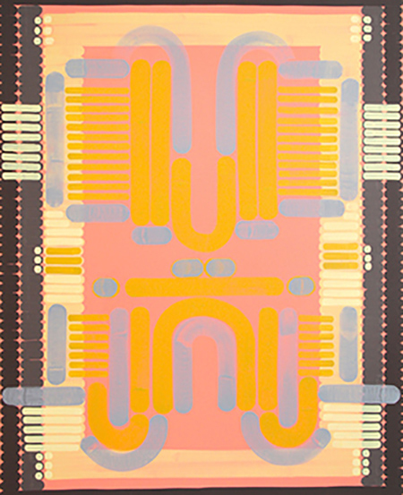 Stockman makes reference to Agnes Martin's use of the grid and minimal forms, but her work is more expressionistic than minimal. She explores figure ground relationships, layering rectangles and circles upon a colored surface. Does the figure obscure the ground or the ground cover the figure? By titling her exhibition “Women," Stockman acknowledges the history of women painters as well as the representation of the female form. However her works are more about the process of painting than defining the feminine or safeguarding feminist ideologies. "DTLA" and "Eastern" have the feel of circuit- or game boards with rounded edges created in soft delicate colors. Stockman's paintings are seductive. They challenge conventional representations in order to become unique works that fuse observable and imagined worlds.