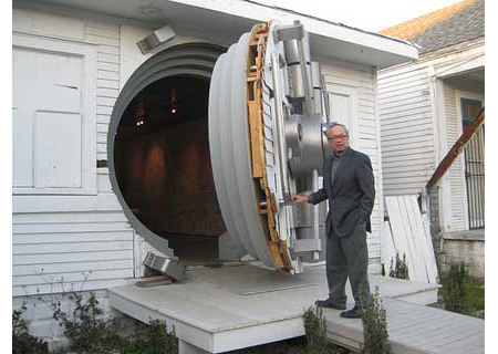 But it is for more than just his fortitude as a conceptual artist that Chin should be considered one of the most important artists of his generation. What moved me deeply, even more so than even a great sculpture could do, was when he spoke about recent projects in New Orleans and the Western Saharan desert. Following Hurricane Katrina, Chin visited New Orleans and learned that residents in the devastated St. Roch area, especially children, had suffered from lead poisoning due to heavy concentrations of lead in the soil. In response, Chin initiated Operation Paydirt, which has engaged communities, scientists, and political activists to work towards the eradication of the lead problem. One of his initiatives, the "Fundred Dollar Bill Project," involves inviting children across the nation to draw original interpretations of $100 dollar bills, to be collected and eventually brought to Congress with the idea of exchanging the Fundreds for real funds to put towards lead elimination. In New Orleans, Chin created “Safehouse" (2008-10), a renovation of a damaged house in the St. Roch district with a bank vault for a facade and the installation of all of those Fundreds inside. When Chin spoke about the opening of “Safehouse," he commented that the black youth were so excited that, for the first time, the police on duty were protecting rather than arresting them.