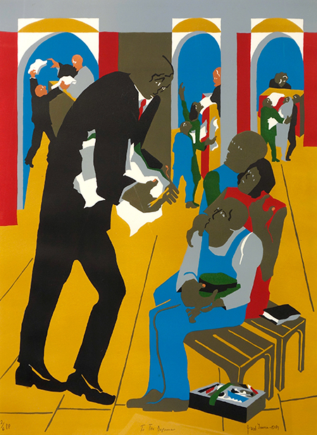 Jacob Lawrence, "To the Defense," 1989, lithograph on Arches paper, 32 x 24". Printed by Kent Lovelace, master printer at Stone Press Editions, Seattle. Published by NAACP Legal Defense and Educational Fund on the occasion of its fiftieth birthday.