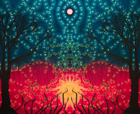 By the mid-90s, Ellis was exhibiting radiant abstract paintings that are inspired by nature but are anything but descriptive. Drawing upon a number of visual language sources, including 60s-era psychedelic posters, Disney films, chaos theory, computer fractals, and Rorschach ink blots, Ellis developed a unique vocabulary for visionary landscapes, one which she has continued to employ over the years. In her earliest works, she would begin by fabricating marbleized paper and then tracing its undulating patterns onto canvas. Next, over a period of several months, she developed her compositions intuitively, applying slow-drying alkyd-based paint, layer upon layer. In the completed paintings, brightly colored monochromatic backgrounds become the staging areas for foregrounds composed of overlapping clusters of nature-inspired patterning. Because alkyd is a synthetic resin, the surfaces of the paintings are pristine and shimmering, which brings a luminous quality to the imagery and makes it all the more compelling.