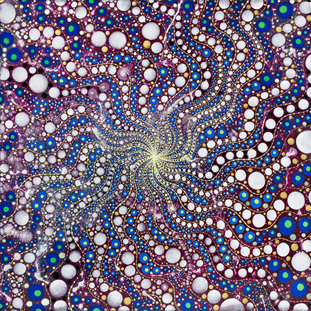 Among the first artists of this genre to emerge in the early 21st century is Barbara Takenaga, who for more than a decade has been producing dazzling abstractions, many of which are executed on a tiny scale, yet yield viewer experiences that are at once enchanting and magical. Based on intricate mathematical systems, Takenaga's paintings owe a debt in part to Yayoi Kusama's dotted works, Fred Tomaselli's night spectacles and the best of 1970s pattern painting. Yet she has created something that is uniquely personal and which eschews the flatness of works by her predecessors in favor of a deeper and more active space. Built up from obsessive renderings of vortex patterns, pinwheels, and cosmic particles set in kaleidoscopic motion, her paintings invite us to move through their space on playful metaphysical journeys, where time has no bounds and lights sparkle with crystalline intensity.