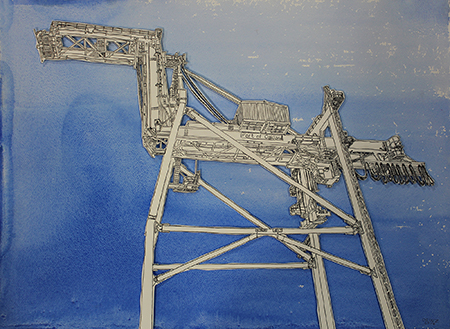 The artist’s sculptures and drawings in this exhibition are primarily inspired by current events. “News Hour” is a flat screen TV crafted from wood, with an expressively painted image depicting PBS news anchor Gwen Ifill in front of a colorful globe of the world. Similarly, “Drones Over San Francisco,” also painted on a wooden flat screen, illustrates the city’s skyline, while the inclusion of several large drones over the harbor supplies ominous overtones to the image.