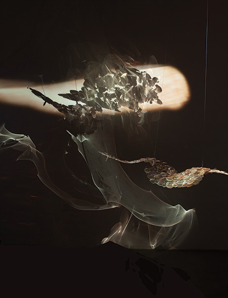 The other works share the same title because each was produced in response to the death of the artist’s mother. The assemblage of eyeglass lenses is suspended to float horizontally in midair, evoking easy associations of magic carpets, birds and, of course, the soul leaving the body. Eschewing banks of light sources and carefully programmed LED displays, a single light element produces a rich cast reflection and shadow. A video projected through the lenses in “Lévitation Ashra #2 (Mom’s Birthday)” revises the literal recording of an internment into a purely visual, constantly morphing mix of drapery and cubistic tumult. If the lenses comprise the only physical object (excluding the lighting fixture), it gains or loses presence from moment to moment as the eye is drawn into that light. The wall between the physical and the ephemeral feels less and less certain.